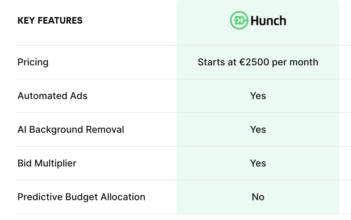 hunch.ai excels in creative production, feeds, and DCO for retail and catalog advertisers. Admanage.ai focuses on reusing, scaling, and operationalizing existing high-performing ads rather than producing creatives.